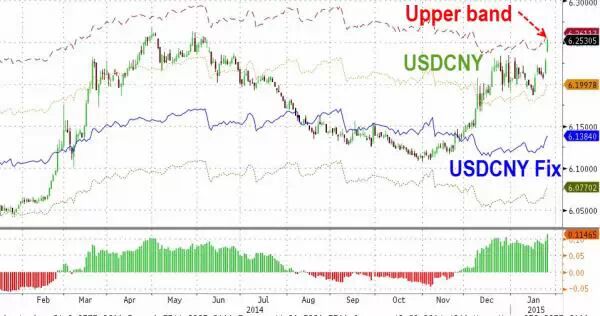而在欧洲央行宣布QE之后,中国央行日内下调人民币中间价,该信号也称为推动人民币贬值的因素之一。