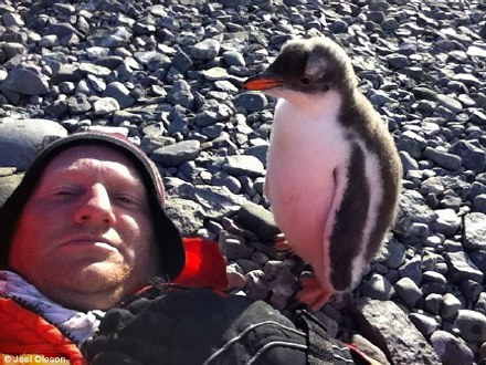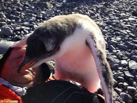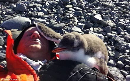 加州的Joel Oleson去南极洲旅游,他躺下的时候,一只小企鹅好奇的凑了过来,蠢萌蠢萌的