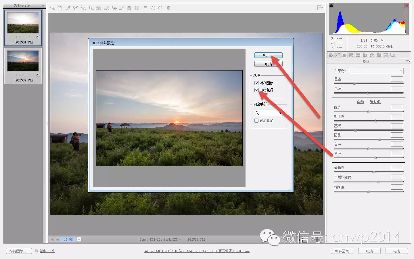 8、根据需要是否选择“自动色调”,点击“合并”。