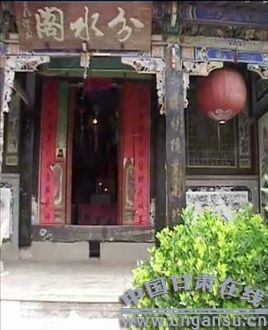建于清乾隆五年(公元1740年),原先仅为一大间,依砚台山,原为龙王庙,主祀炳灵真君。1940年秋,新增设的金华乡公所和关家店初小同立于此庙院,故将龙王庙扩大成三大间。庙内西院建两层木质门楼两小间,其门楼下为山门,门外砌有多台石阶,傍有楸树。最初大殿和门楼背依砚台山,面朝河水,庙前高地有四通之路,殿门顶有民国天水专员胡绶谦所书“忠勤敦朴”匾额。因有雨水分流奇观,后人便称之为分水阁。此地又恰地处三国文化木门道遗址必经交通线上,分水阁南望可见的峡口,实为上木门道之所在。 著名书法家苏适光先生的“滴洒江河”,原邓宝珊将军的秘书张举鹏的楹联“万里东书城一统,千年河汉生政檐”,还有那“两下江河”、“华夏一奇”、“去龙战海”、“妙化江河”、“阁分江河”、“分水嶺”等匾额和“两面坡分流江河,一檐水横贯南北”,“通判古今善恶人,嶺分南北清浊水”,“山水锋直池墨飞龙凤,殿如嶺峻滴水分江河”等楹联,让人眼花瞭乱,欣赏不够。