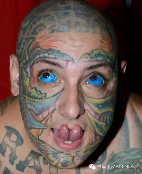 ▲ Matt Gone 地球上纹身覆盖率最高的骚年,高达 99%。除了手掌,全身上下都是纹身,对了,也包括 JJ 和舌头!他的眼球选择的是全蓝色。